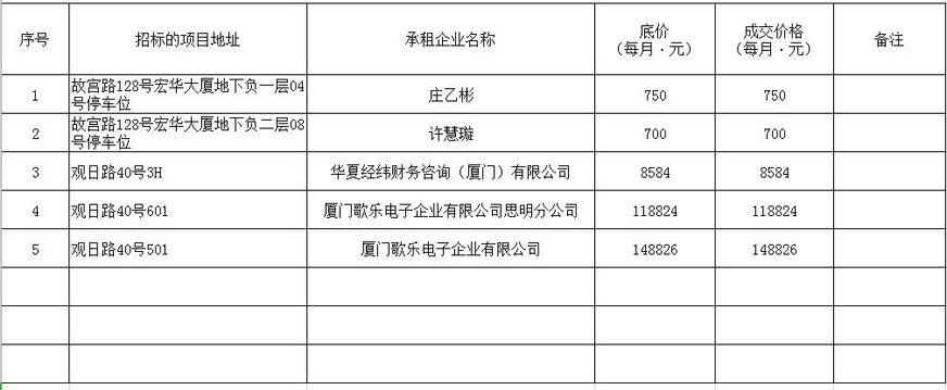 根據(jù)思明區(qū)國(guó)有企業(yè)資產(chǎn)出租管理的相關(guān)制度,我司2020年1月10日上午9:00起于觀音山營(yíng)運(yùn)中心2號(hào)樓2層2號(hào)會(huì)議室進(jìn)行公開招租現(xiàn)場(chǎng)開標(biāo),現(xiàn)通過思明控股網(wǎng)站對(duì)外發(fā)布成交公告,內(nèi)容如下: