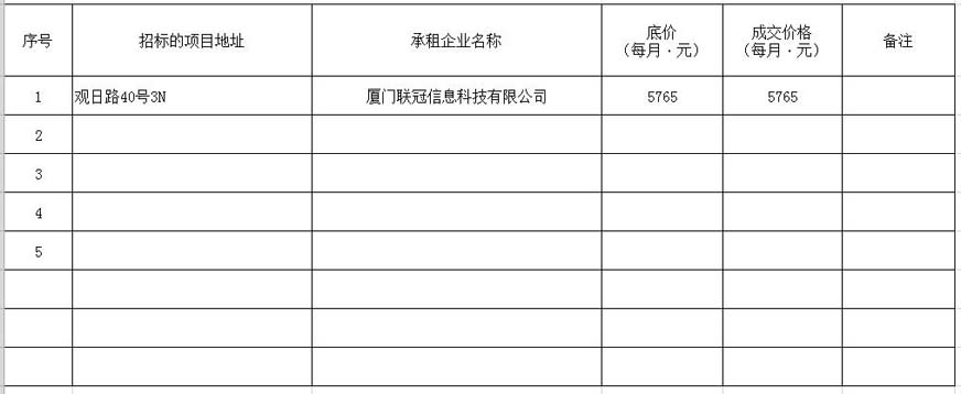 根據(jù)思明區(qū)國(guó)有企業(yè)資產(chǎn)出租管理的相關(guān)制度,我司2020年5月8日上午9:00起于觀音山營(yíng)運(yùn)中心2號(hào)樓2層2號(hào)會(huì)議室進(jìn)行公開招租現(xiàn)場(chǎng)開標(biāo),現(xiàn)通過思明控股網(wǎng)站對(duì)外發(fā)布成交公告,內(nèi)容如下: