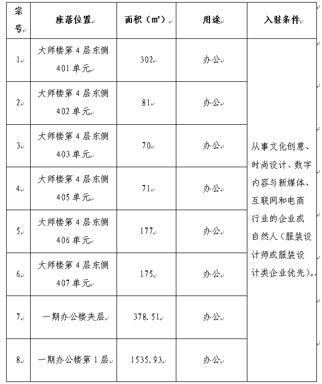 根據(jù)國有企業(yè)資產(chǎn)出租管理相關(guān)制度,我司決定對位于龍昌路12號、誼愛路100號嘉蓮商務(wù)中心下列8宗房產(chǎn)對符合入駐條件的意向承租人進(jìn)行公開競價招租,具體信息如下: