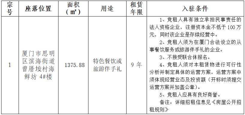 曾厝垵海鮮坊4#樓房產(chǎn)公開招租公告