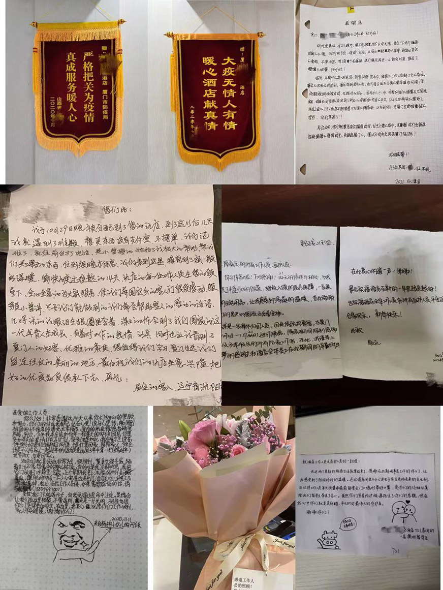 在這400多個(gè)日日夜夜中,我們思明區(qū)的隔離酒店專班共接收7萬多名入境旅客。在接收過程中分流到酒店的入境人員大多數(shù)對(duì)廈門及各地的防疫政策的不了解、不理解及需要引導(dǎo)等,入境旅客中有情緒激動(dòng)的老人、有懷孕37周多的待產(chǎn)婦、也有生活無法自理的殘疾人、精神病患者、更有遇到困難尋求幫助的旅客,需要我們酒店專班工作人員耐心細(xì)致解釋廈門市及各地的防疫政策、及時(shí)疏導(dǎo)隔離人員焦慮的情緒,并引導(dǎo)隔離人員用良好的心態(tài)度過酒店留觀隔離期,體現(xiàn)全心全意為境外人員服務(wù)的高尚情懷。通過我們專班人文關(guān)懷、解難幫困,做到每個(gè)留觀人員最終理解這是為了全國(guó)人民的健康和為國(guó)家的安全應(yīng)盡的義務(wù),都積極主動(dòng)配合,積極在公眾平臺(tái)上傳導(dǎo)正能量,隔離期間常有關(guān)心、慰問工作人員、隔離結(jié)束后常有留下字條、定制錦旗等溫暖舉動(dòng),通過寫感謝信、送鮮花、錦旗等方式表達(dá)感謝,專班工作得到旅客的認(rèn)可,在工作上的委屈、苦累和汗水瞬間化為烏有。