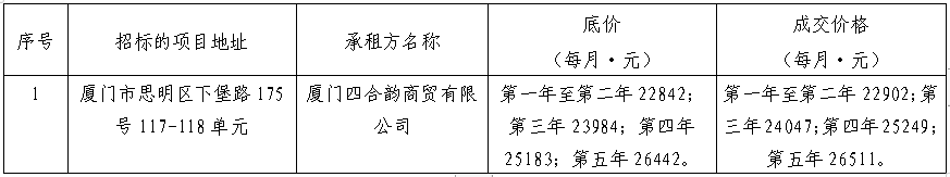 根據(jù)思明區(qū)國(guó)有企業(yè)資產(chǎn)出租管理的相關(guān)制度,我司2021年7月8日上午10:00起于廈門(mén)市思明區(qū)臺(tái)東路157號(hào)102單元會(huì)議室進(jìn)行公開(kāi)招租現(xiàn)場(chǎng)開(kāi)標(biāo),現(xiàn)通過(guò)思明控股網(wǎng)站對(duì)外發(fā)布成交公告,內(nèi)容如下:
