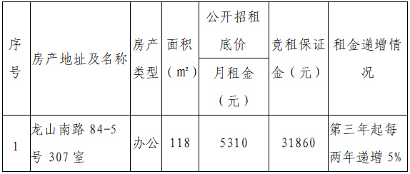 根據(jù)國(guó)有企業(yè)資產(chǎn)出租管理相關(guān)制度,我司決定對(duì)位于龍山南路84-5號(hào)307室房產(chǎn)對(duì)符合入駐條件的意向承租人進(jìn)行公開(kāi)競(jìng)價(jià)招租,具體信息如下: