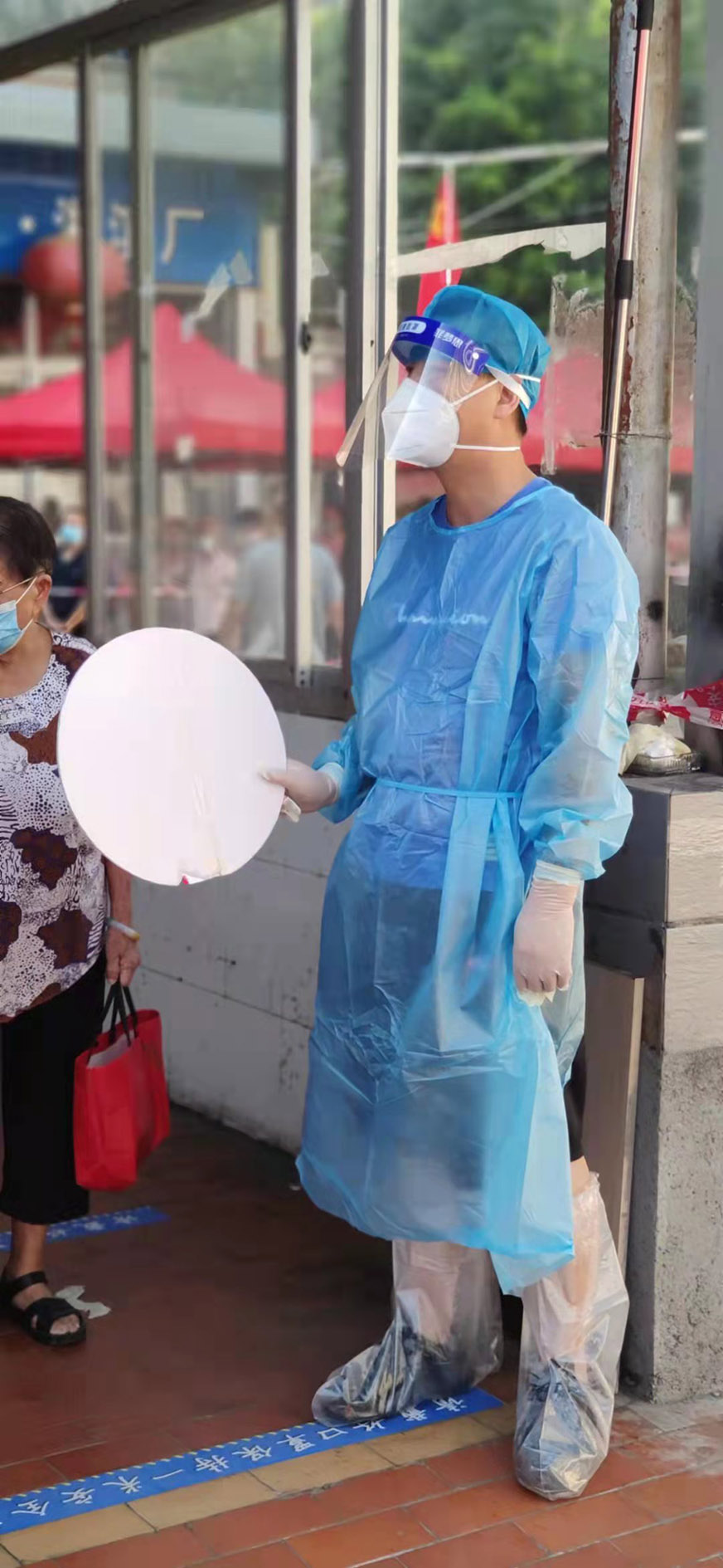 9月的廈門依然驕陽似火,志愿者們戴著口罩、面罩、手套,穿著厚重的防護(hù)服,夏日的陽光如同有火的萬箭照射在他們身上,他們恍然不覺,手上揮舞著牌子,嘴上念叨著:“請(qǐng)大家保持距離,請(qǐng)間隔一米”,“請(qǐng)出示健康碼”,“請(qǐng)?zhí)崆皽?zhǔn)備好登記碼或者身份證……”。有的市民等候得心煩氣躁了,他們極力安撫;有的市民不知如何進(jìn)行預(yù)登記,他們耐心指導(dǎo)......, 志愿者們這樣一站就是六七個(gè)小時(shí),防護(hù)服下的衣服就像在水里撈過似的,有的同事中暑了,有的同事頭痛耳鳴了,有的同事渾身酸痛、疲憊不堪,但他們都不肯休息,依然堅(jiān)持不懈,站好自己的一班崗。大家只有一個(gè)共同目標(biāo)——讓廈門重歸美好。