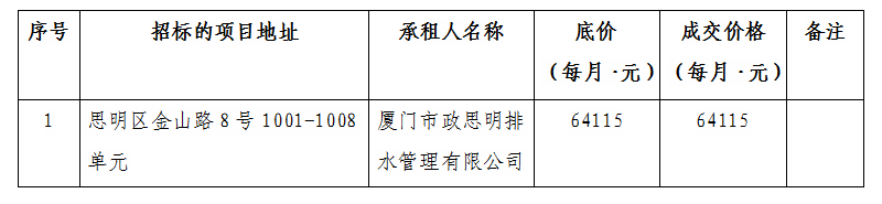 根據(jù)思明區(qū)國(guó)有企業(yè)資產(chǎn)出租管理的相關(guān)制度,我司2021年12月17日上午10:00起于廈門市思明區(qū)嶺兜西路623號(hào)3樓商管公司會(huì)議室進(jìn)行公開(kāi)招標(biāo)現(xiàn)場(chǎng)開(kāi)標(biāo),現(xiàn)通過(guò)思明控股網(wǎng)站對(duì)外發(fā)布成交公告,內(nèi)容如下: