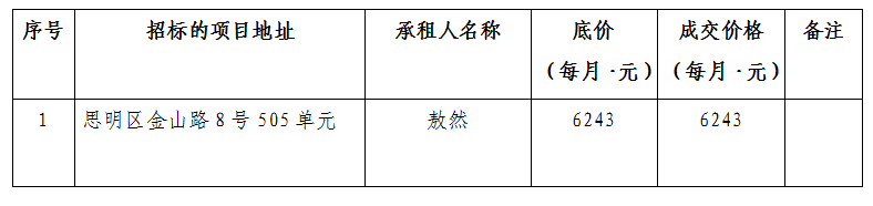 根據(jù)思明區(qū)國有企業(yè)資產(chǎn)出租管理的相關(guān)制度,我司2021年11月28日上午10:00起于廈門市思明區(qū)嶺兜西路623號(hào)3樓商管公司會(huì)議室進(jìn)行公開招標(biāo)現(xiàn)場開標(biāo),現(xiàn)通過思明控股網(wǎng)站對(duì)外發(fā)布成交公告,內(nèi)容如下: