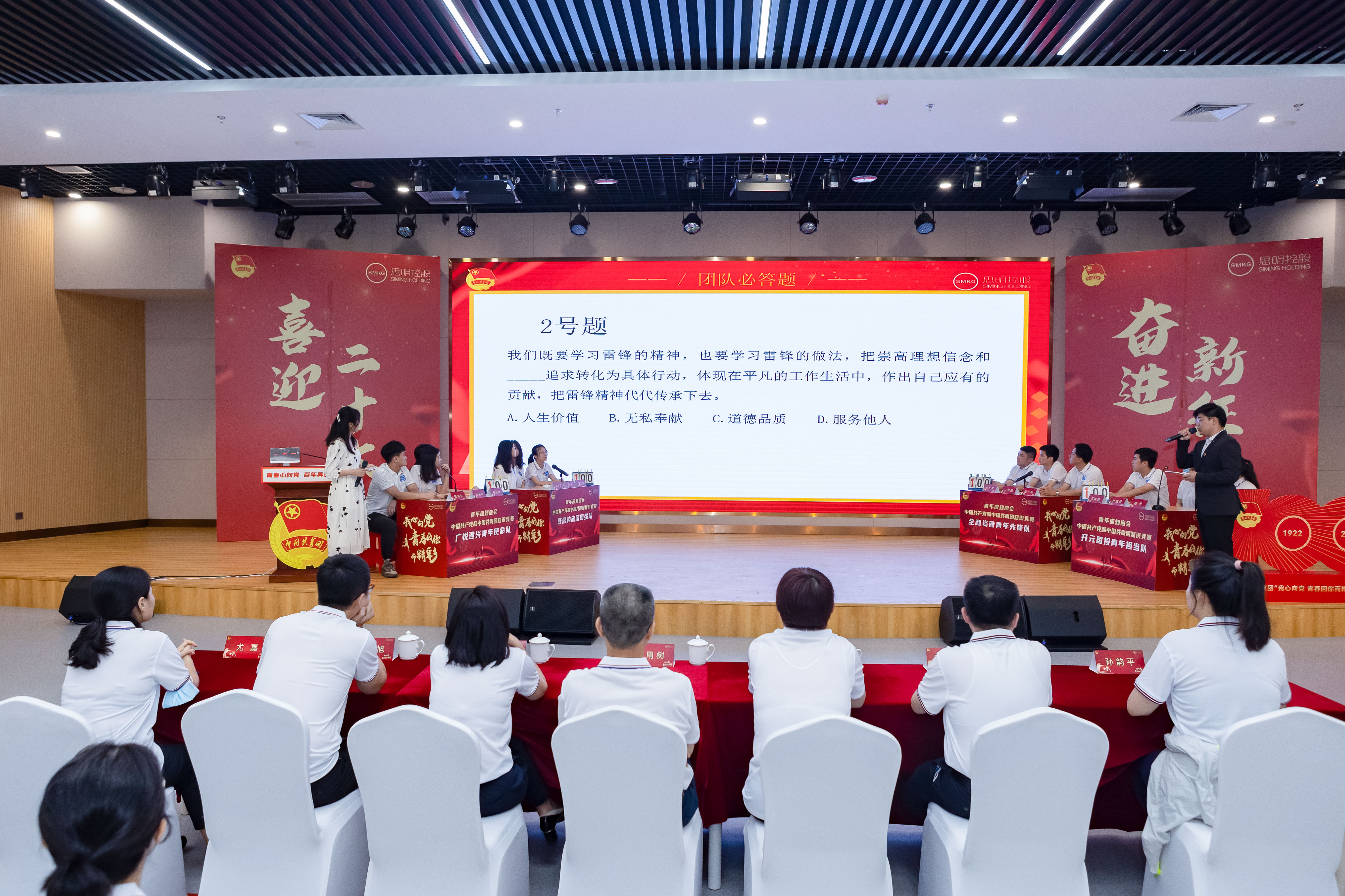 思想政治教育是新時(shí)代團(tuán)員青年的一堂必修課。 “青年應(yīng)知應(yīng)會(huì)”——中國(guó)共產(chǎn)黨和中國(guó)共青團(tuán)知識(shí)競(jìng)賽精彩紛呈,緊張激烈。通過(guò)團(tuán)隊(duì)必答題、個(gè)人必答題和搶答題三個(gè)環(huán)節(jié)角逐,廣悅建興青年使命隊(duì)榮獲一等獎(jiǎng),全和資管青年先鋒隊(duì)、鼓浪嶼旅游青年圖強(qiáng)隊(duì)和開(kāi)元國(guó)投青年擔(dān)當(dāng)隊(duì)分別獲得二等獎(jiǎng)、三等獎(jiǎng)和優(yōu)勝獎(jiǎng)。