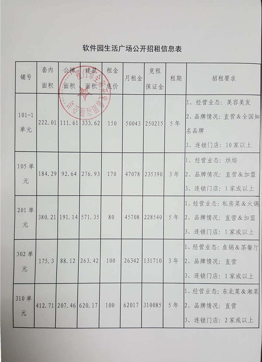 4、招租要求:詳見附表(軟件園生活廣場(chǎng)公開招租信息表)