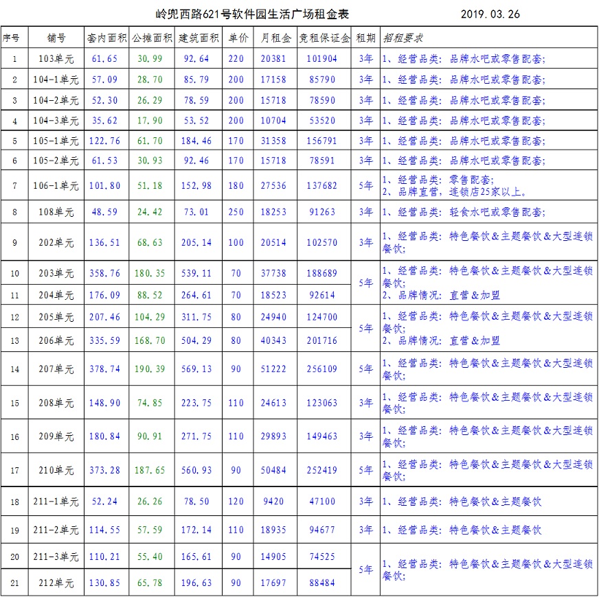 招租要求:詳見(jiàn)附表(軟件園生活廣場(chǎng)公開(kāi)招租信息表)