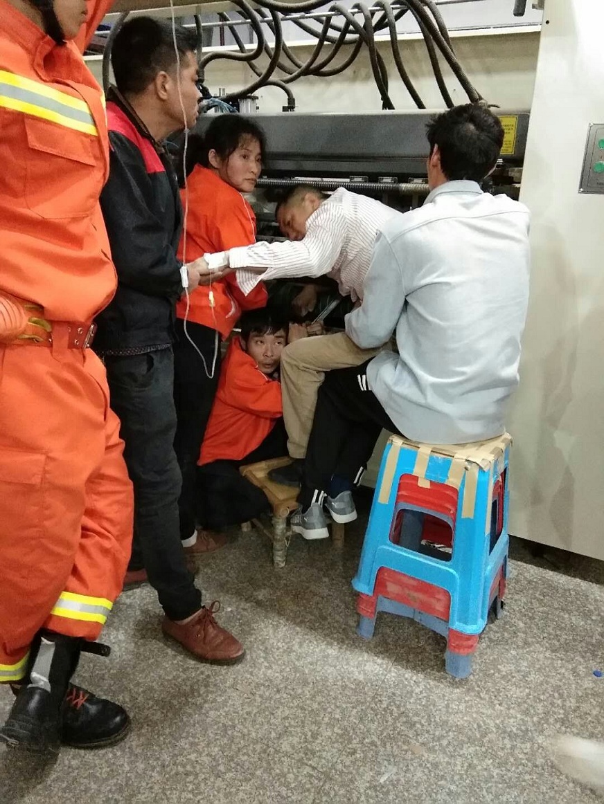 一個普通工人的手臂牽動著業(yè)主、物業(yè)管理人、消防官兵、120救援中心的心。因為機(jī)臺大,切割產(chǎn)生的高溫和火花易對傷者造成二次傷害,救援難度極大。救援小組迅速調(diào)整方案,用液壓擴(kuò)張器將轉(zhuǎn)軸與機(jī)壁頂開,經(jīng)過半個多小時的不懈努力,傷者成功脫險,最終保住了手臂。